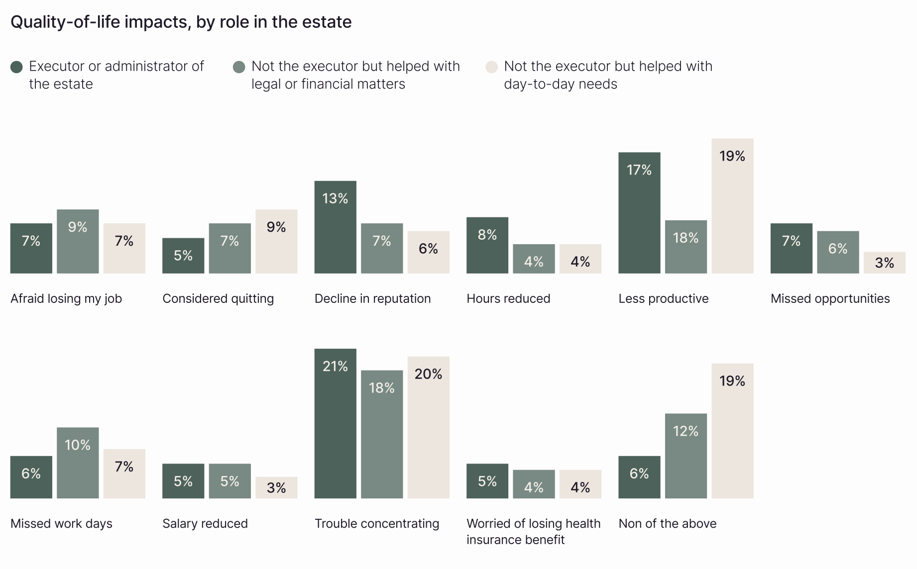 - Nearly 70% of executors reported that their work was impacted by the roles they had to play after the death, and the vast majority of them reported emotional and physical impacts (78%, and 93% respectively.)